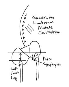 In her writings and books, Dr. Travell recognized that a common yet overlooked “perpetuating factor” for chronic discogenic back pain and counterbalancing muscular stress was a structural difference in the length of the lower limbs. It has been documented since 1946 that about 75% of people have legs of unequal lengths, and that about a third of people have leg length differences that contribute to chronic back pain. As a rule, the sacrum is lower on the side of the short leg (see drawing below). The spinal column initially tilts towards the short leg, then compensates back to the midline as a consequence of chronic contraction of the quadratus lumborum muscle.