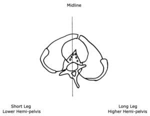- The sacrum is lower on the side of the short leg (left in this drawing).